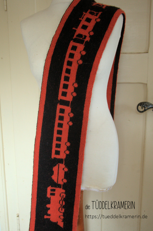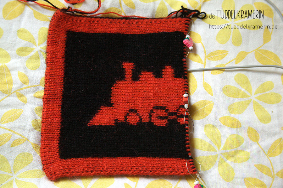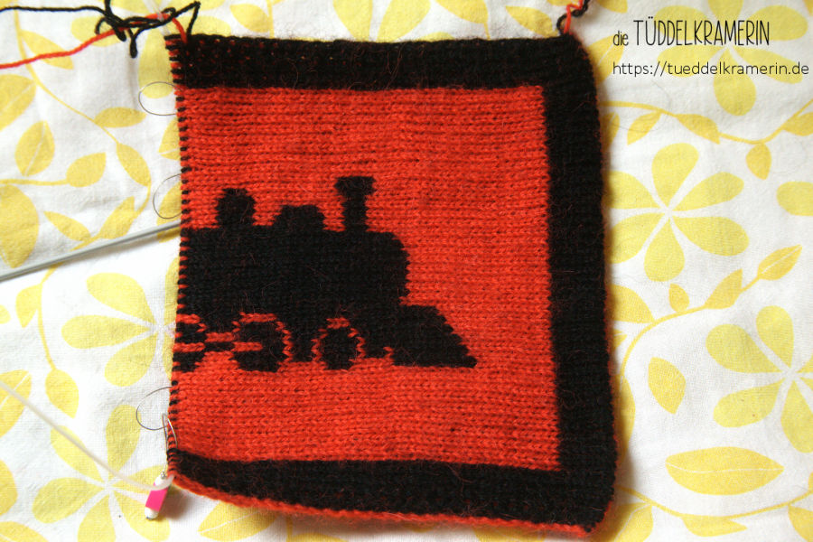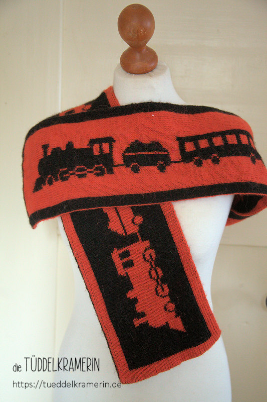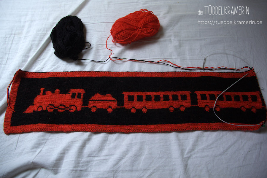 Motive: Die Vorlagen sind gut ausgearbeitet und einfach nachzuarbeiten. Ich habe von der Spitze der Lok aus gearbeitet, weil ich mir unsicher war, wie lang der Schal werden soll. Da die Vorlagen nur 22 Maschen breit sind, habe ich an den Seiten noch Maschen und einen Rand hinzugefügt, so kam ich auf insgesamt 48 Maschen und etwa 20 cm Breite.